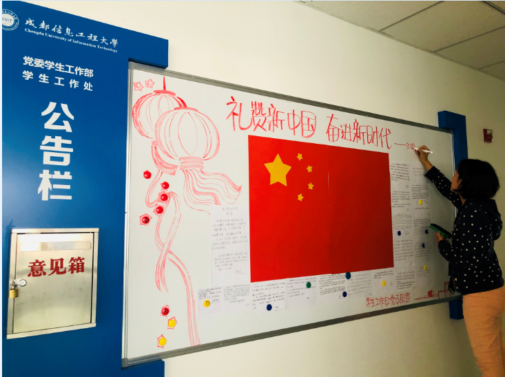 【本网讯】为庆祝中华人民共和国成立70周年,加强党员同志的爱国主义教育、增强党员同志的民族自豪感、坚定理想信念,学生工作处党支部通过办公区域布置、办板报专栏、制作国防宣传栏喷绘、官网等形式在校园内营造热烈的节日气氛,热烈庆祝新中国成立70周年。