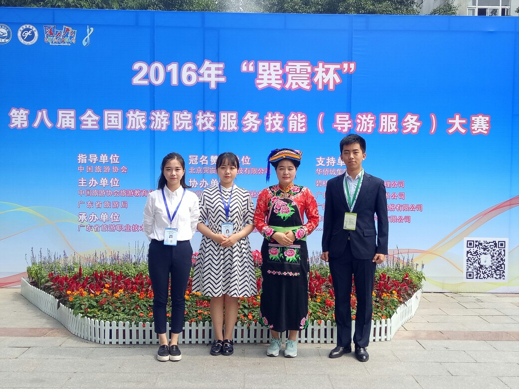 【本网讯】5月12日-14日,我校管理学院旅游管理专业杨丽娟带队到广州参加了中国旅游协会举办的2016年“巽震杯”第八届全国旅游院校服务技能(导游服务)大赛,取得了高校英文组二等奖、最佳才艺奖的佳绩。