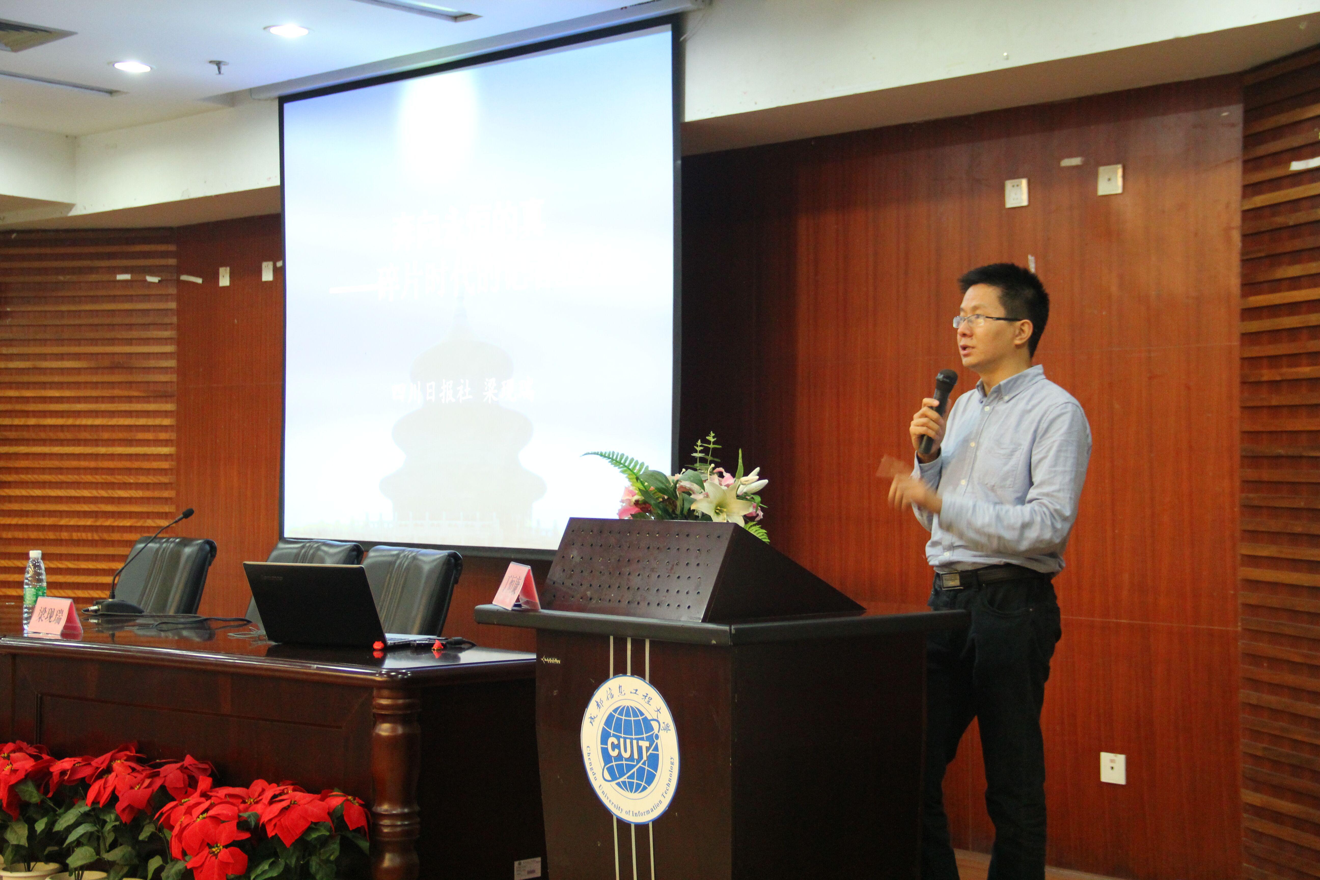 【本网讯】10月14日,由环球官方宣传统战部主办、新媒体联盟承办的“CUIT校媒菁英汇”系列培训第一场活动在航空港校区学术报告厅举行,本次讲座邀请到《四川日报》的首席记者梁现瑞老师作题为“巨变时代的记者生存”讲座。学校各部门、学院教师代表,校报记者团、新媒体学生代表、各学院学生代表等参加讲座。
