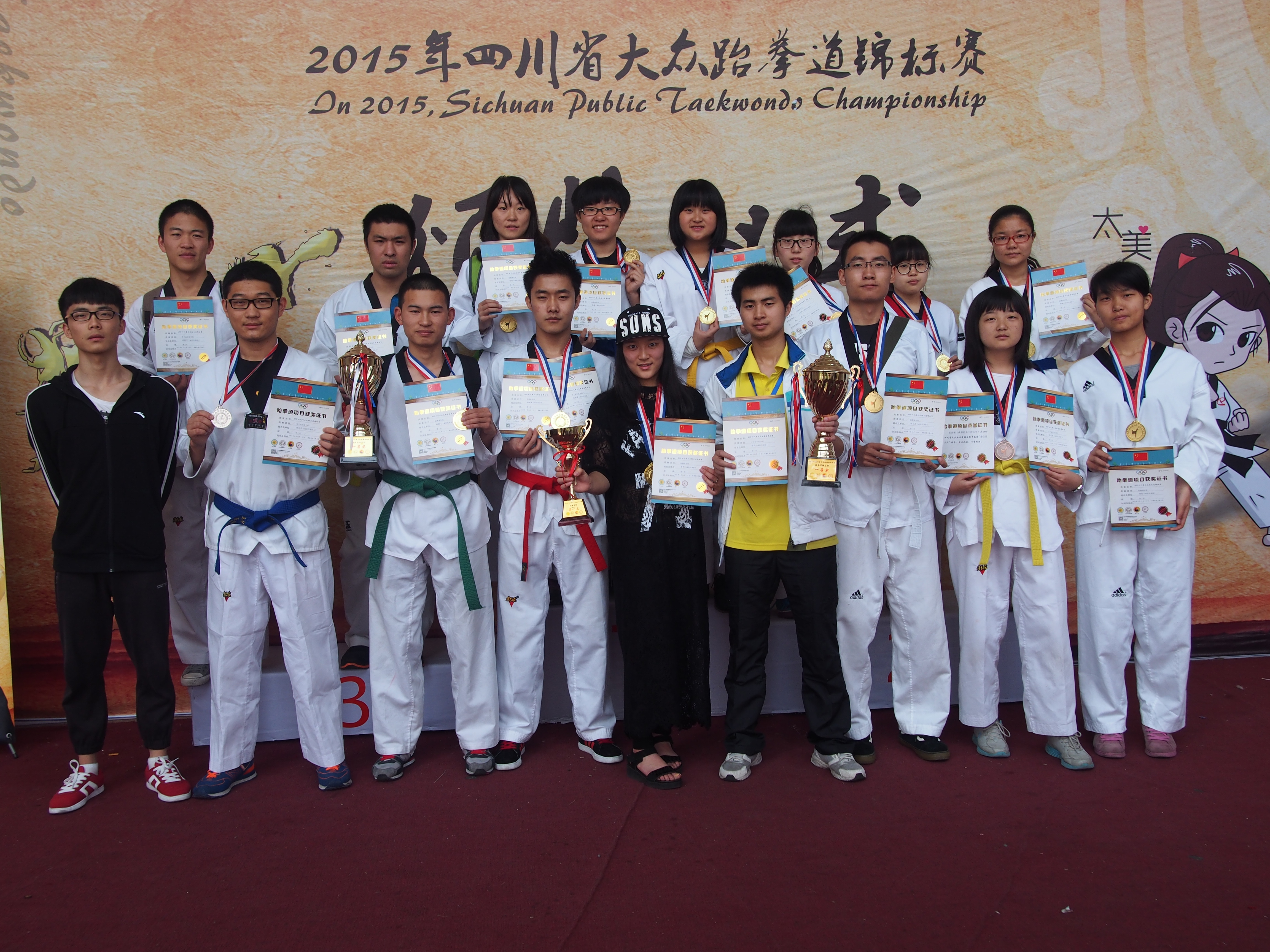 【本网讯】春风吹战鼓擂,4月11日上午,我省最大的跆拳道赛事—2015年四川省大众跆拳道锦标赛在我院体育馆隆重召开。此次比赛由四川省跆拳道协会主办,来自全省各地多支代表队的千名选手参加。为期两天比赛分为竞技比赛、品势比赛、击破比赛、特技比赛、跆舞比赛,男子、女子组选手被分成成年组、青年组、少年组、儿童组四个组别进行擂台竞技。主办方本着对赛风、赛纪的严肃态度,特邀国际级裁判理同新老师担任技术代表,并增派10名国家级裁判参与到赛事的裁判工作中。