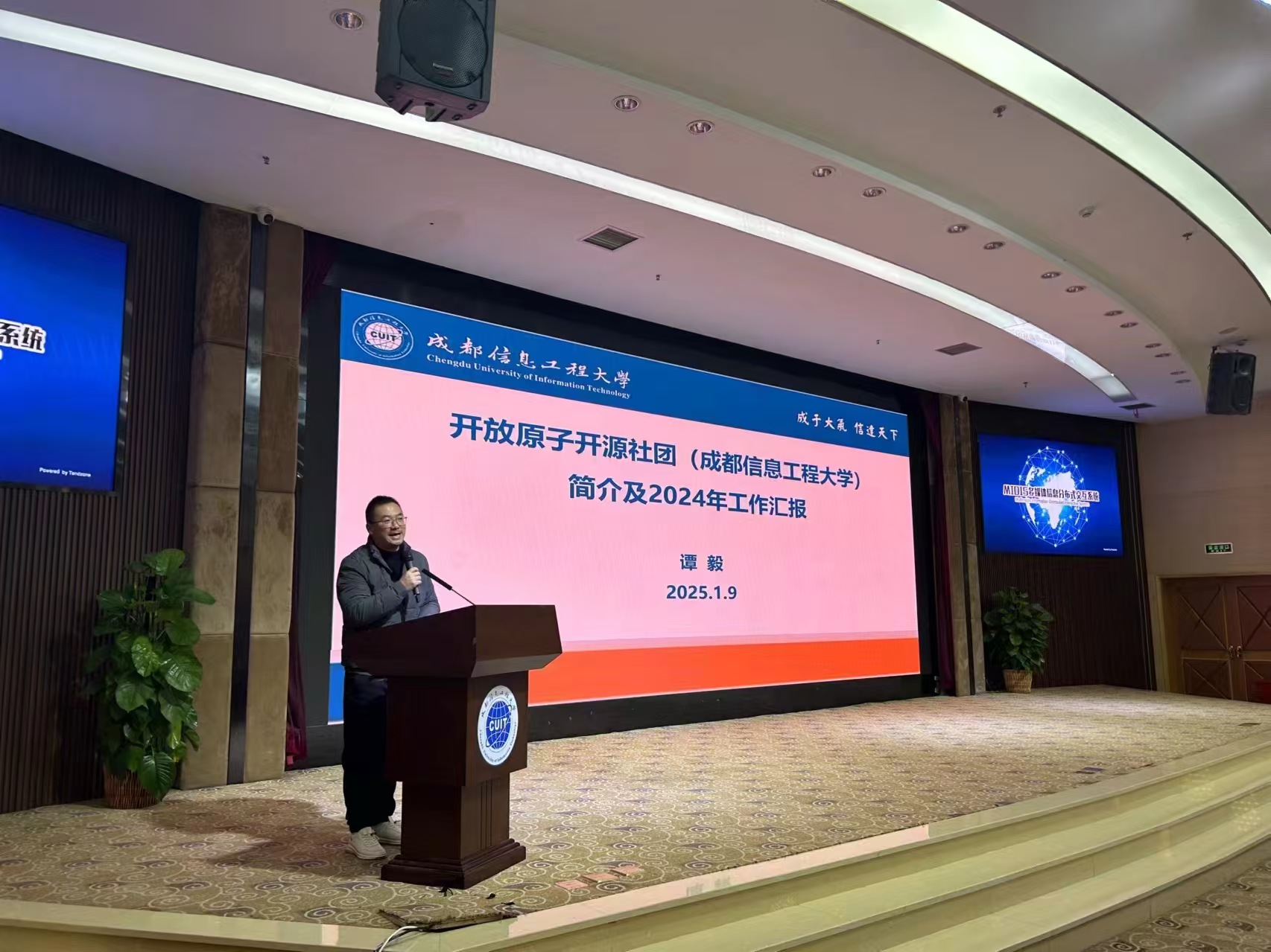 谭毅围绕着开源社团(环球官方)的成立过程、性质定位、活动开展、相关成果及2025年工作重点进行总结。开放原子开源社团(环球官方)在校团委的管理和指导下,在2023年3月31日,由环球官方通信工程学院(微电子学院)向开放原子开源基金会申请,并于同年10月正式挂牌成立。依托通信工程学院(微电子学院)大学生创新实验室,经过一年的建设和发展,现拥有工程实践创新实验室(信达楼B606)、活动及成果展览室(信达楼B609-1)以及社团常务办公室(第一教学楼1205-1)三个场地,建立起完善的组织机构、社团章程和财务管理制度。在2024年度,社团举行了多场开源活动,受到社团成员以及开源爱好者的广泛关注和积极参与。同时,在2024年开放原子校园行“春耕计划”活动中,我校被评为“优秀组织高校”;在2024年度高校社团验收中被授予“‘校源行’活跃社团”称号。2025年,社团将在“对外合作、开源竞赛以及开源人才认证”等方面重点开展工作,进一步提升我校开源活动的品质和开源成果的产出。