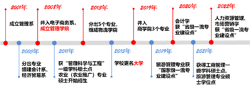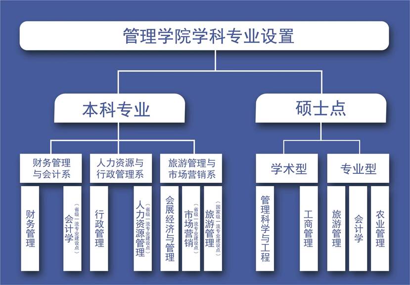 学院现设有财务与会计系、人力资源与行政管理系、旅游管理与市场营销系;设有管理科学与工程一级学科硕士点(工学学位、管理学学位)、工商管理两个一级学科硕士点;设有农业管理、会计学、旅游管理三个专业学位硕士授权点。随着专业结构优化调整,现有5个招生专业,国家级一流本科专业建设点1个(旅游管理),省级一流本科专业建设点3个(会计学、人力资源管理、市场营销)、财务管理。管理学院是学校师生规模最大的学院,现有在校研究生、本科生2600余人。