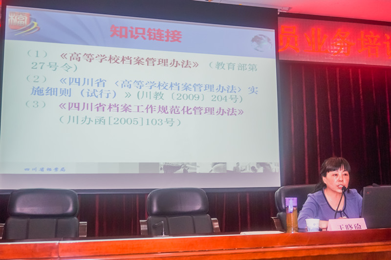 13日下午,王晓瑜为参培人员作了题为“业务与标准——规范开展高校档案工作”的专题辅导讲座。她针对高校档案日常管理工作,详细介绍了档案的收集、整理、分类、鉴定等具体环节和操作流程,并重点对高校党群、科研、基建、仪器设备等文书档案和科技档案的规范化管理进行了示范演练和重点讲解说明。