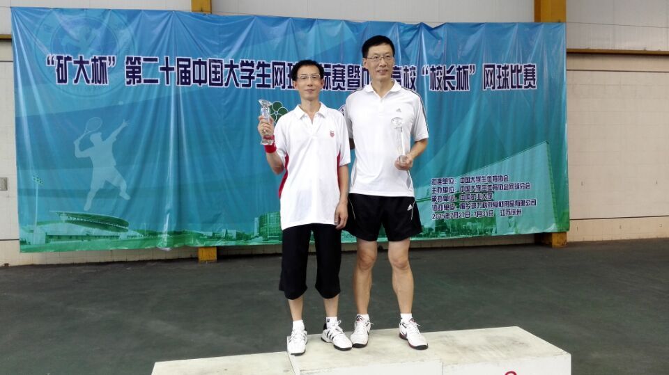 【本网讯】日前,从徐州中国矿业大学传来佳讯,在刚刚收拍的第二十届全国大学生网球锦标赛暨全国高校“校长杯”网球比赛上,我校党委书记赖廷谦与成都职业技术学院院长贺继明再度联手,登上了本届赛事校长丙组的最高领奖台。