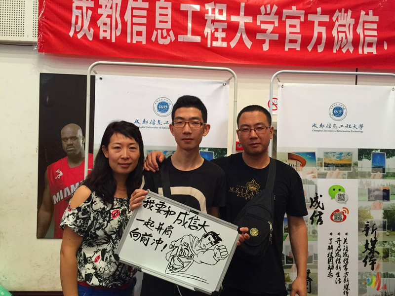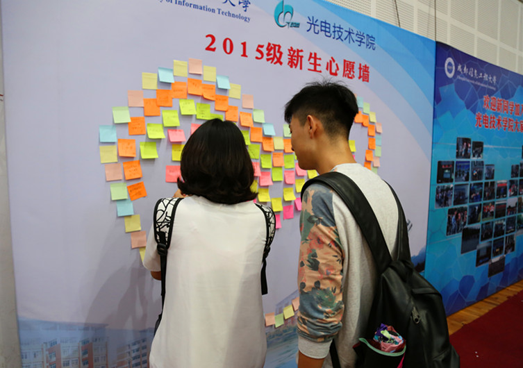 在各学院报到点,除了常规的迎新展板、新生手册,各学院及部门结合自身学科特色,在迎新形式上推陈出新,营造了独特的迎新氛围。电子工程学院报到处显示出“拒绝溺爱、家长止步”的标语,表明大学不仅意味着学习新知识,也是独立生活的开始;光电技术学院新生报到处巨大的“新生心愿墙”,点燃了新同学对大学生活的向往;物流学院的新生“点赞墙”,表达了新同学对物流学院的认同感;成信官方新媒体为关注官方微信的新生及家长留下了入学第一天的精彩瞬间,倍受新同学青睐。