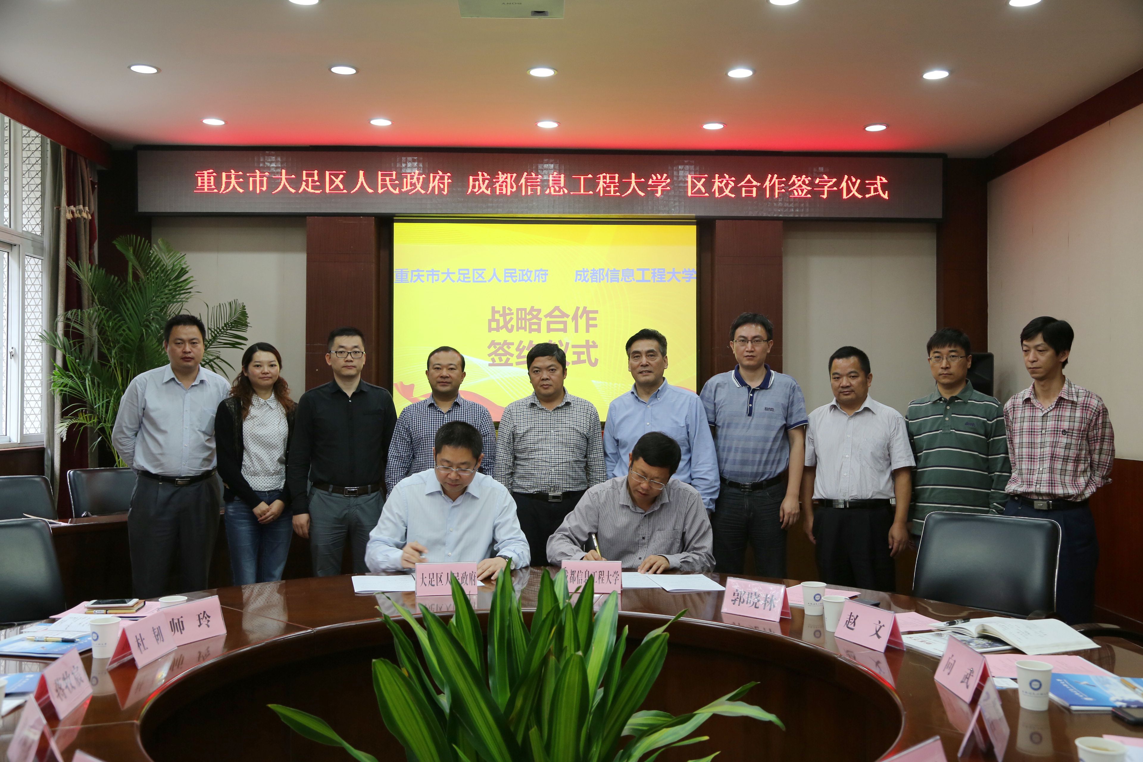 【本网讯】10月16日上午,学校与重庆市大足区人民政府在行政楼六会议室签署了战略合作协议。学校副校长向武,学校科技处、招生就业处、控制工程学院、物流学院、成信资产经营有限公司,重庆市大足区区委常委、区委办主任、万古工业园区党工委书记、管委会主任蒋牧宸,区政府法制办、区科委、万古工业园区、万古镇相关负责人等参加了签约仪式。签约仪式由我校控制工程学院院长巨辉主持。