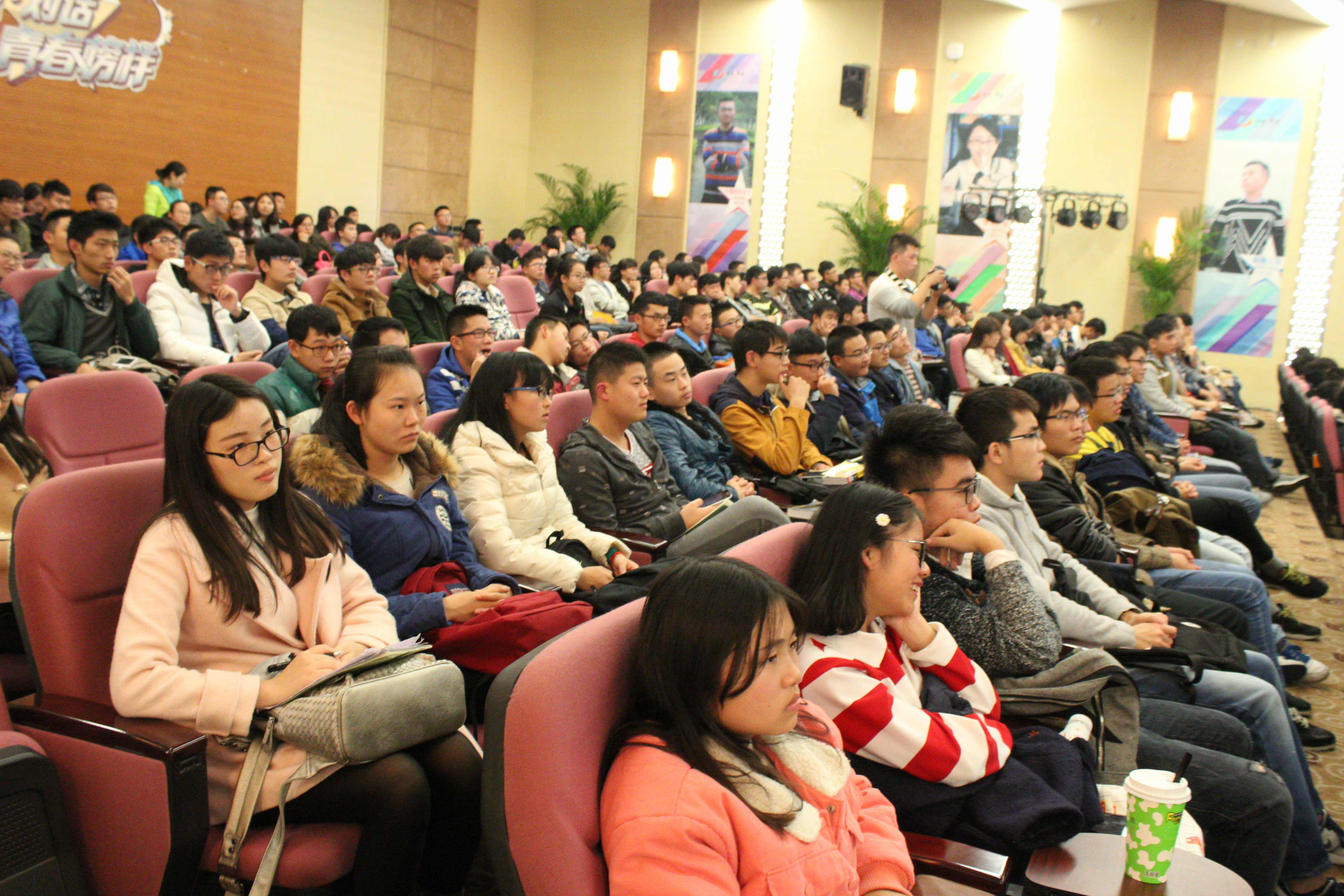 【本网讯】我校2015年度“聚焦·对话  青春榜样”宣讲会于2015年12月7日—12月10日在航空港校区国际会议厅和龙泉校区学术报告厅顺利举行,本次活动由学生工作处主办、计算机学院承办。本期聚焦·对话青春榜样共举办四场,航空港校区和龙泉校区各两场,学校副校长于世祥、学生工作处处长戴丽红、副处长潘光林、陈智勇以及部分学院党总支书记、全体辅导员、近1200名学生分别参加了本次活动。活动由控制工程学院辅导员田晓旭、信息安全工程学院辅导员何佩遥主持。