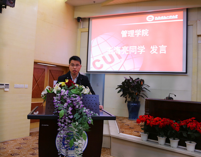 管理学院王海亮同学代表全体新生对学校领导、各位老师和工作人员致以崇高的敬意和诚挚的感谢。他代表全体新同学郑重承诺:同学们将发扬成信人的精神,严守道德准则、科学严谨、一丝不苟的作风,虚心修业,探索求知;同时以饱满的热情,全心投入来完成三年的学习,以优异的成绩回报社会。