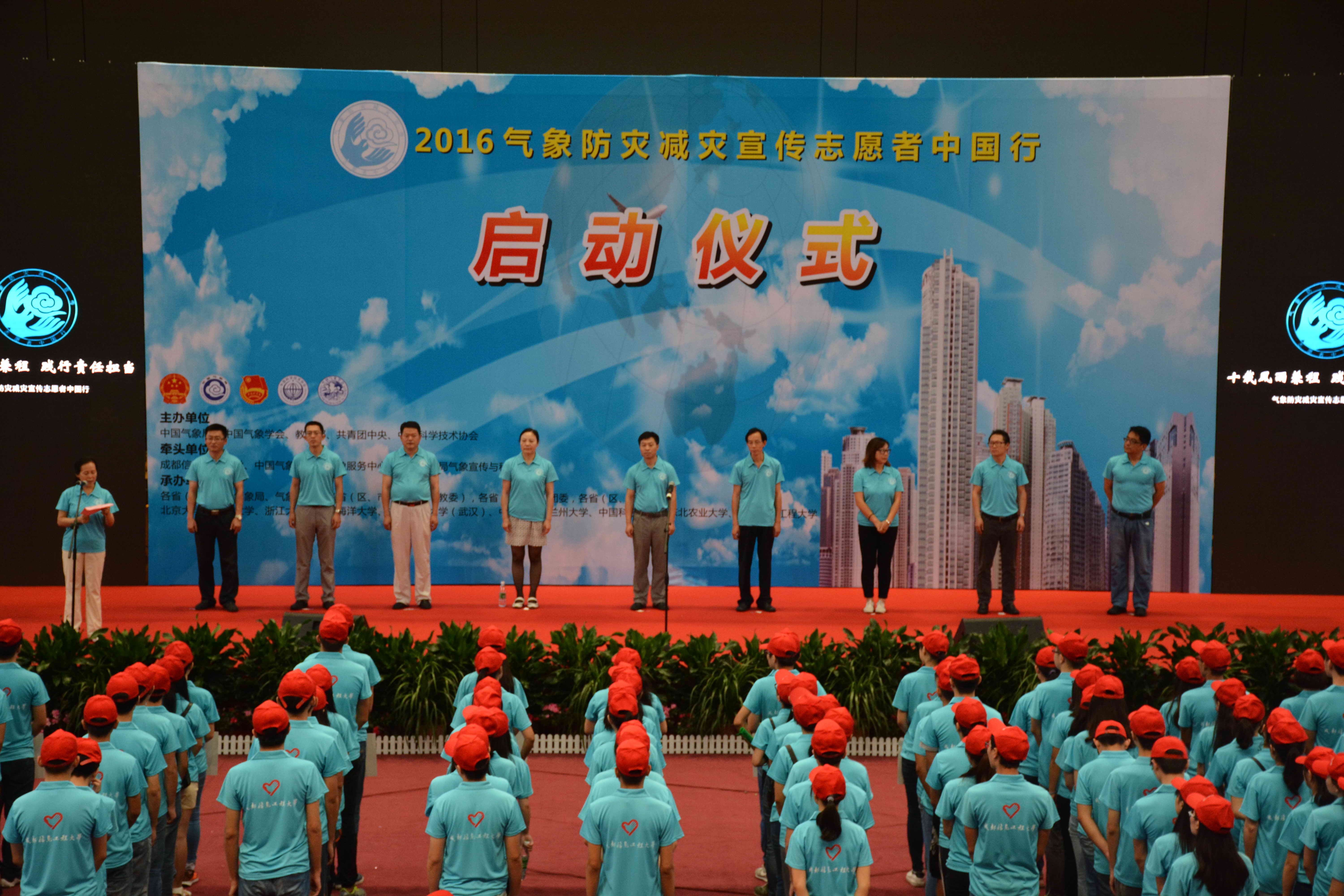 洪兰江宣布“气象防灾减灾宣传志愿者中国行”活动正式启动。启动仪式现场,与会领导向各省志愿者代表授旗,我校大气探测学院学生刘远志代表志愿者领誓。