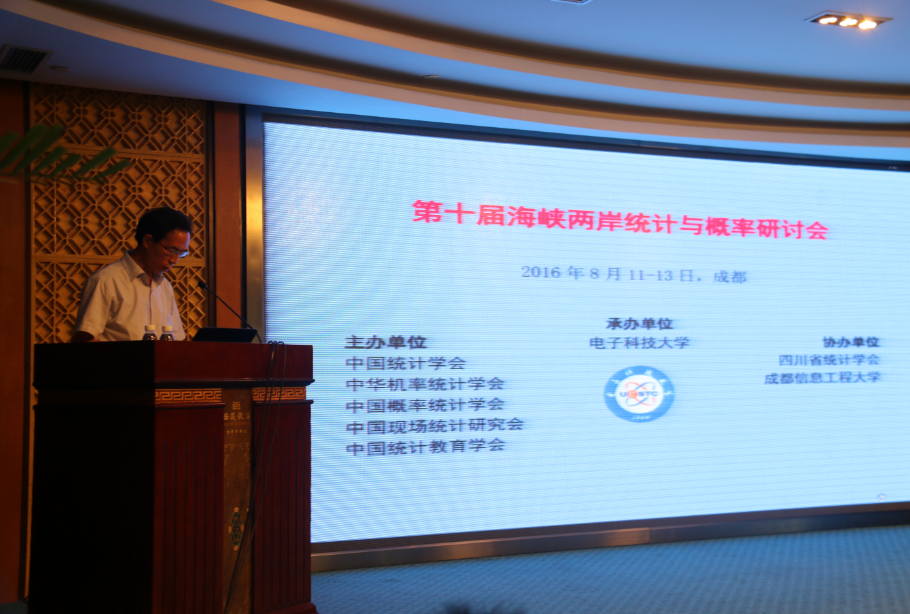 【本网讯】8月12日上午,由中国统计学会、中华机率统计学会、中国概率统计学会、中国现场统计研究会、中国统计教育学会主办,电子科技大学承办,四川省统计学会和环球官方协办的“第十届海峡两岸统计与概率研讨会”在成都西藏饭店隆重举行。电子科技大学副校长熊彩东教授、中国统计学会常务副会长徐一帆先生、台湾代表李燊铭教授、大陆代表何书元教授、我校党委书记赖廷谦教授、四川省统计局局长陈炜先生先后向大会致辞。来自海内外的218名学者参会,其中台湾代表40名,香港代表9名、大陆代表(含统计系统代表)132名,还有部分来自新加坡、韩国和英国学者。