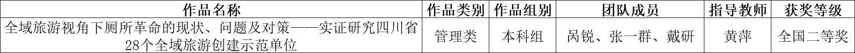 本届竞赛由共青团中央、中国科协、教育部、中国社科院、全国学联和北京市人民政府共同主办,北京航空航天大学承办,共计1513件参赛项目参加全国复赛,经过网络初评、集中复评,共有213所高校的400余件作品入围全国终审决赛,其中来自四川省参赛高校的10件作品入围,我校哲学社科类作品《全域旅游视角下厕所革命的现状、问题及对策——实证研究四川省28个全域旅游创建示范单位》位列其中。经过终审决赛的严格评审,竞赛评审委员会最终评出35件特等奖作品、105件一等奖作品、286件二等奖作品。