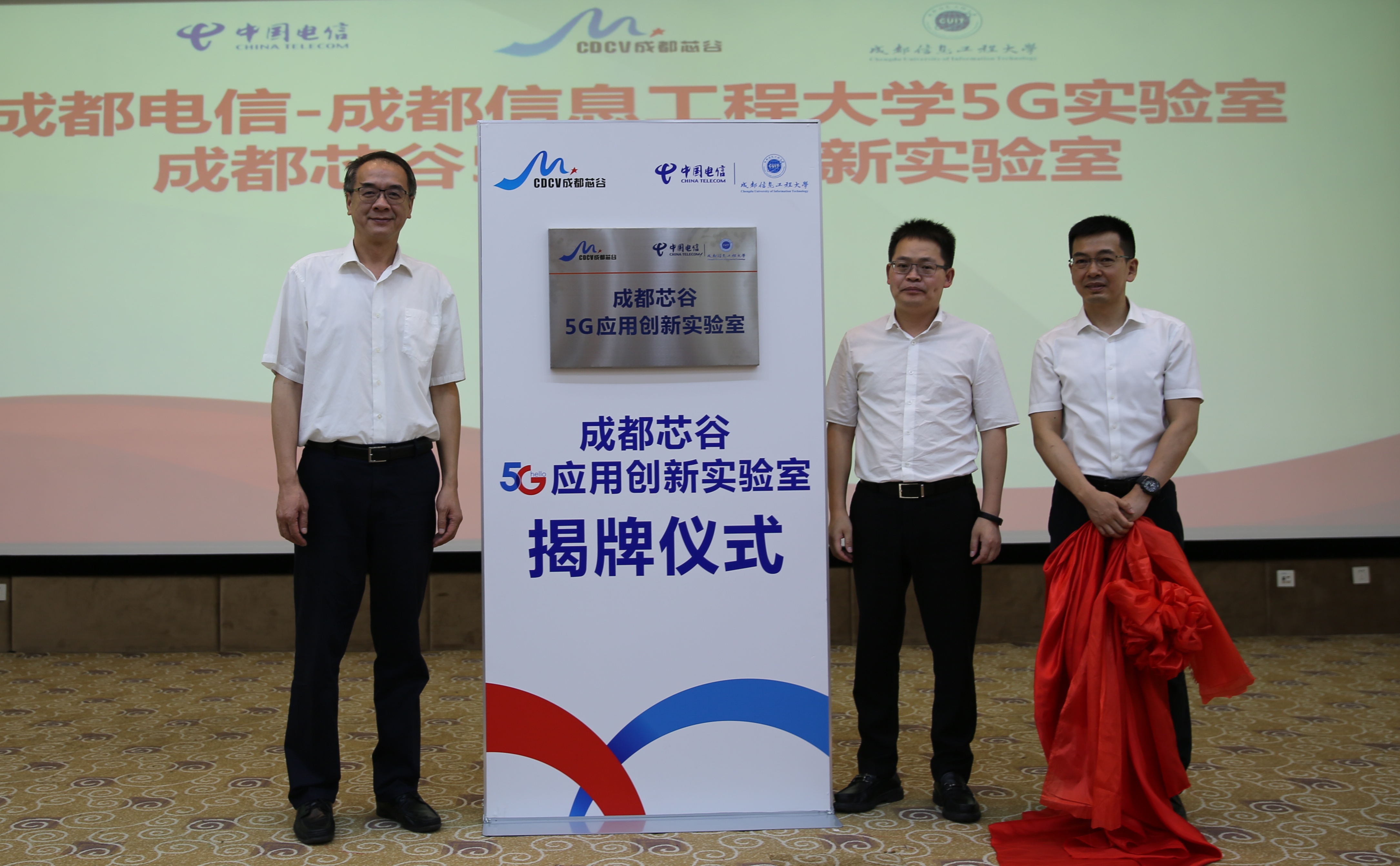 余敏明、杨洋为“成都电信-环球官方5G实验室”揭牌。韩超、余敏明、杨洋为“成都芯谷5G应用创新实验室”揭牌。