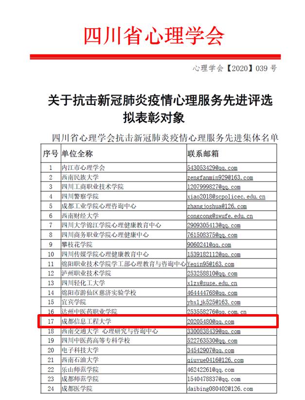 【本网讯】为深入贯彻习近平总书记在全国抗击新冠肺炎疫情表彰大会上的重要讲话精神,大力弘扬伟大抗疫精神,经四川省心理学会常务理事会研究,决定评选表彰一批新冠肺炎疫情防控社会心理服务工作先进集体和先进个人。我校荣获“四川省心理学会抗击新冠肺炎疫情心理服务先进集体”荣誉称号,心理健康教育中心蔡良华、李泽志,大气科学学院陈玲、软件工程学院万娟、资源环境学院欧美娅、管理学院翟艳荣被授予“四川省心理学会抗击新冠肺炎疫情心理服务先进个人”荣誉称号。