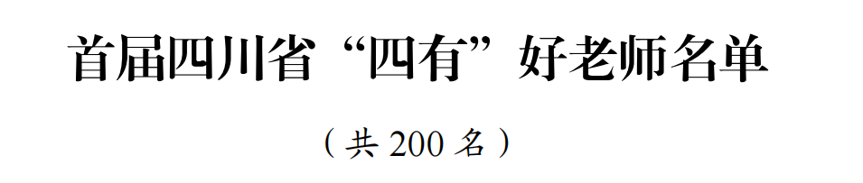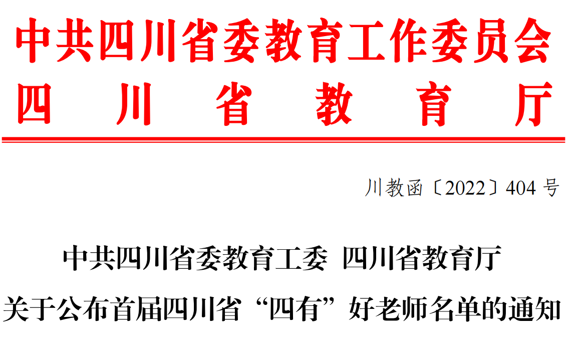 为热烈庆祝第38个教师节,充分展示新时代人民教师教书育人的动人风采和先进事迹,进一步营造全社会尊师重教的浓厚氛围,不断激励广大教师以实际行动迎接党的二十大胜利召开,中共四川省委教育工委、四川省教育厅组织开展了首届四川省“四有”好老师评选工作,经各地各校民主推荐、严格把关、层层遴选,我校陈科艺教授及全省从事教育教学工作者共200名同志被评为首届四川省“四有”好老师。