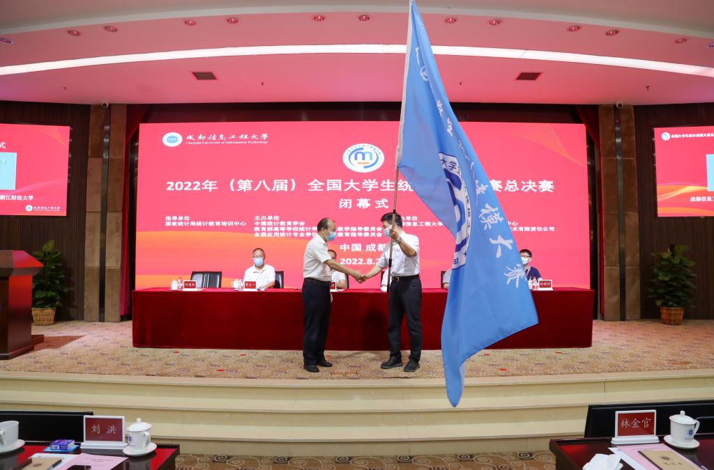 闭幕式上,我校副校长何建新与浙江财经大学副校长董进才举行了赛旗交接。董进才代表浙江财经大学表示,浙江财经大学将全力组织好承办好明年全国大学生统计建模大赛,全方位地为各参赛团队做好服务保障工作;希望在明年赛事中,有更多的老师和同学参加到统计建模竞赛中来,将理论知识应用于实践,在青年学子中播散统计智慧的种子。