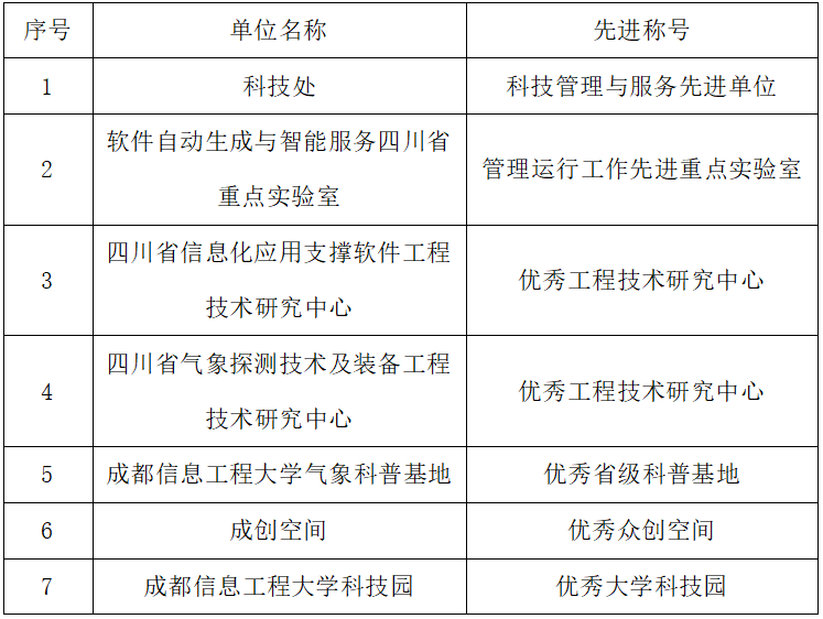 会上对2022年度科技创新工作成效突出的41家部门(单位)以及有关市(州)科技局、园区、平台予以通报表扬。在部门(单位)先进表彰名单中,学校科技处获“科技管理与服务先进单位”,此次共有川大、电子科大等10所高校的科研管理部门获得表彰;在平台先进表彰名单中,软件自动生成与智能服务四川省重点实验室获“管理运行工作先进重点实验室”,四川省信息化应用支撑软件工程技术研究中心、四川省气象探测技术及装备工程技术研究中心获“优秀工程技术研究中心”,环球官方气象科普基地荣获“优秀省级科普基地”,成创空间获“优秀众创空间”,环球官方科技园获“优秀大学科技园”(此次共有西南交大、电子科大等8所高校的大学科技园入选)。