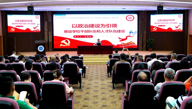 周激流围绕习近平新时代中国特色社会主义思想的丰富内涵,主题教育的总要求和根本任务,结合推进学校高质量发展的工作实际,与大家深入交流了学习习近平新时代中国特色社会主义思想的认识和体会。他结合“不断提升政治能力、思维能力、实践能力”的要求,从党的政治建设是党的根本性建设;加强党的政治建设,关键是提高各级各类党组织和党员干部政治能力;以政治建设引领我校的干部队伍;以政治建设引领我校的师资队伍建设四方面展开讲授。