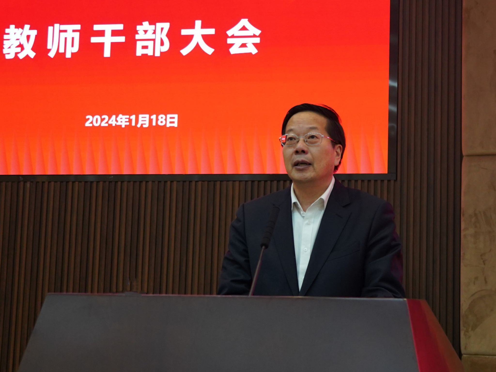 校长何建新总结了学校2023年来取得的工作成绩,分析了当前学校发展存在的问题和面临的形势,谋划了2024年学校工作要点和任务举措。他指出,2023年是全面贯彻落实党的二十大精神的开局之年,是三年新冠肺炎疫情防控转段后经济恢复发展的一年,也是学校以审核评估推进高质量发展、以博士点授权加快高水平建设的关键之年。一年来,全校教职员工坚持以习近平新时代中国特色社会主义思想为指导,全面贯彻党的教育方针,落实立德树人根本任务,圆满完成各项任务。他强调,推动学校各项事业高质量发展,关键在各级干部。各单位要按照2024年重点工作方向提前思考、主动谋划具体的落实措施,制订“任务书”和“路线图”,明确“时间表”,绘制“施工图”。团结和带领广大教职员工以挺膺担当、奋发有为的姿态,不折不扣抓落实、雷厉风行抓落实、求真务实抓落实、敢作善为抓落实,坚定不移地将各项改革引向深入,为推进学校高质量内涵发展作出新的更大的贡献!