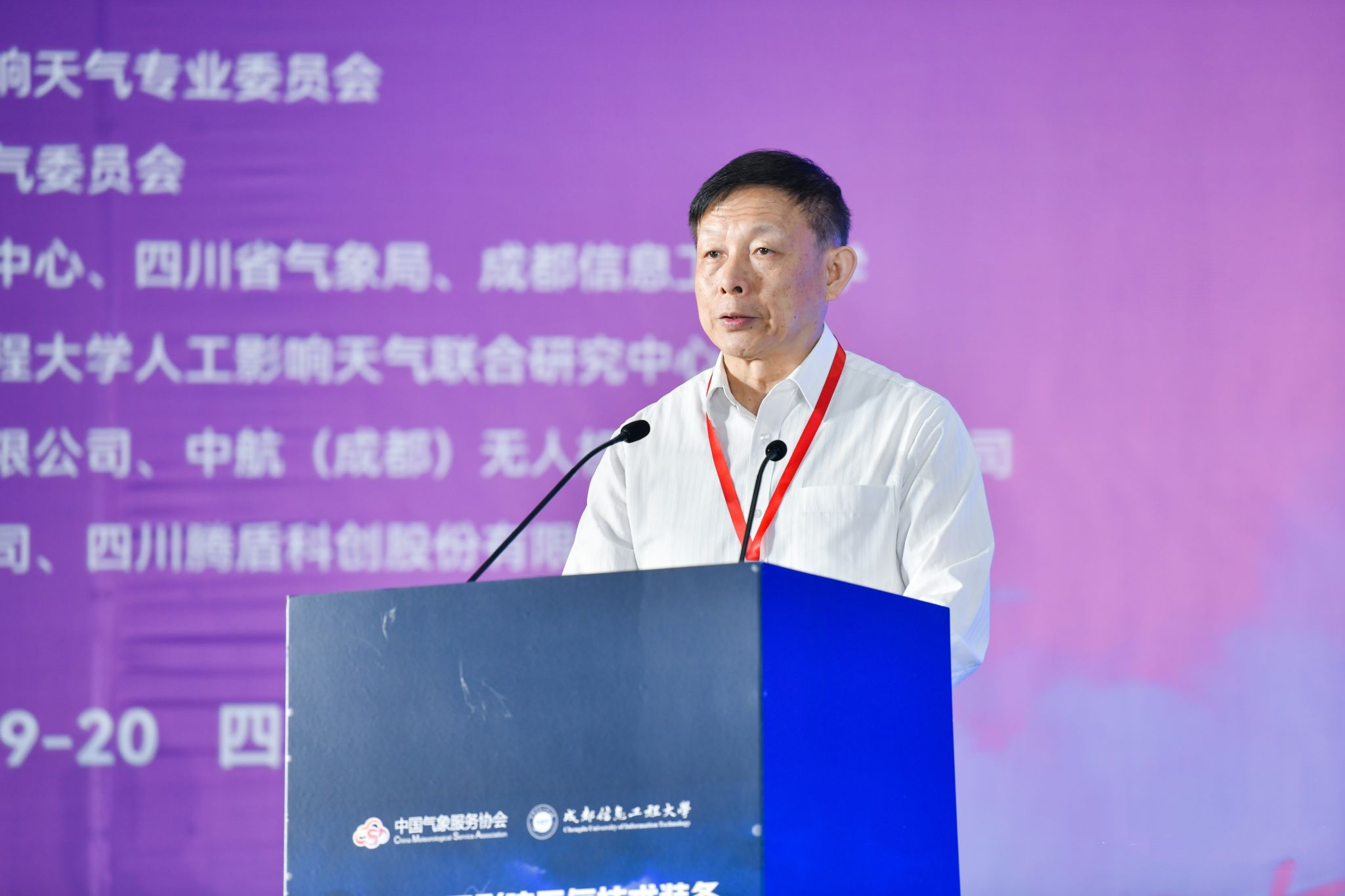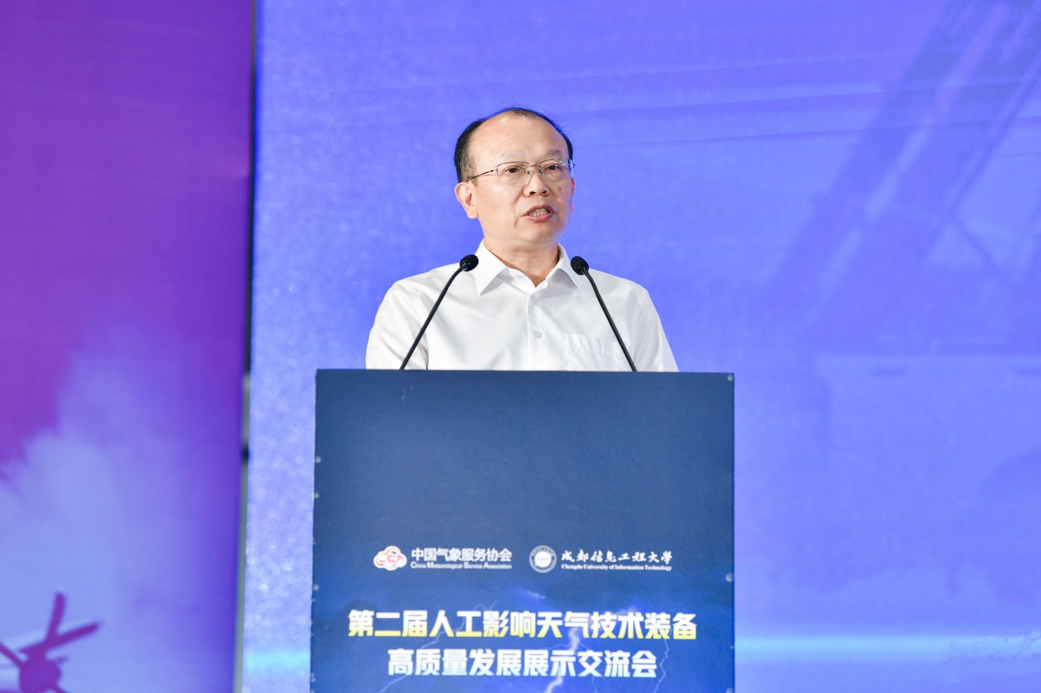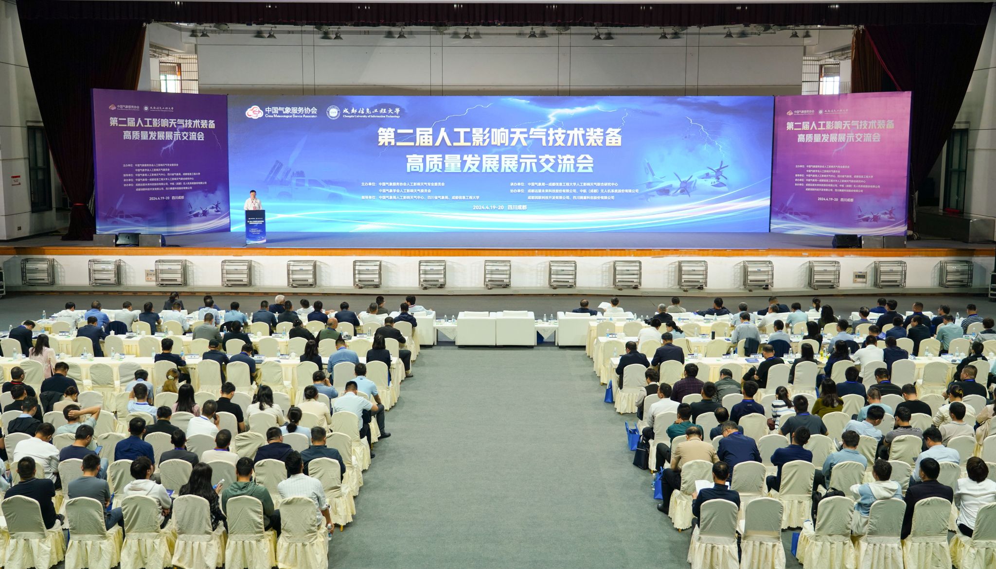 中国气象服务协会会长许小峰,中国气象局减灾司人影处处长孙锐,中国气象局人工影响天气中心主任李集明、副主任周述学,四川省气象局局长彭军、副局长姚志国,学校校长何建新、副校长舒红平,四川省学校国有资产与教育装备中心资产管理中心、四川省经济和信息化厅装备工业处、双流区人民政府、成都芯谷发展服务局等单位嘉宾,以及来自全国各地的人工影响天气协调管理、装备生产、技术研发、业务应用、服务保障等领域的200余名专家出席会议。近40家气象行业高科技企业参加了人工影响天气技术装备高质量发展建设成果展。