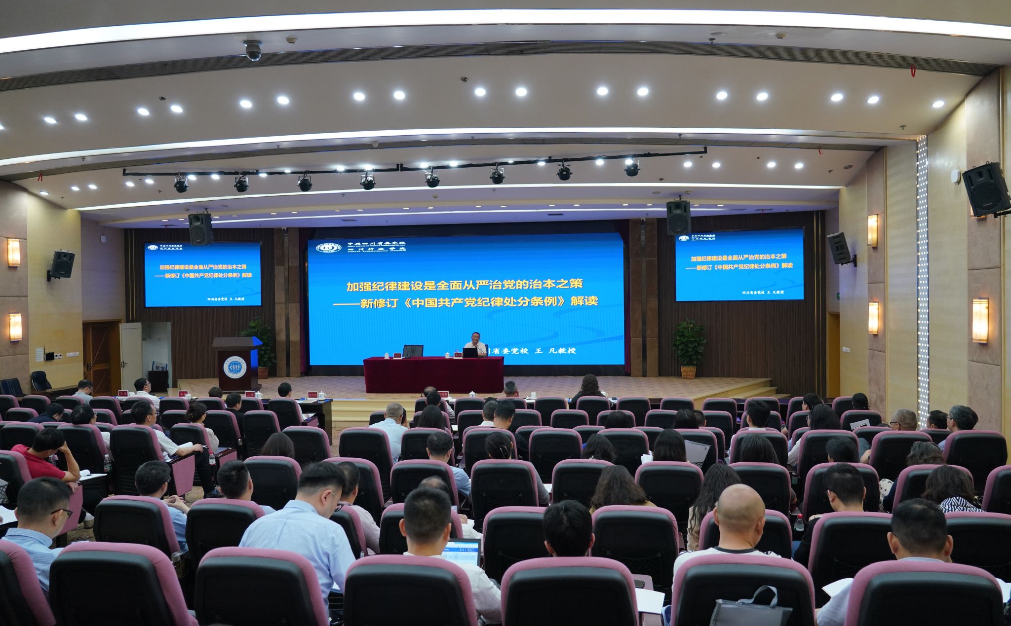 王凡教授以《加强纪律建设是全面从严治党的治本之策——新修订<中国共产党纪律处分条例>解读 》为题,带领大家回顾了中国共产党百年来加强党的建设的光辉历程,提出了全面从严治党必须思想建党和制度治党紧密结合、一体推进。他指出,党在百年建设过程中形成了比较完善的党内法规制度体系,《中国共产党纪律处分条例》(以下简称《条例》)对维护党章和其他党内法规的贯彻执行具有十分重要的作用。王凡教授将理论和实践相结合,历史与现实相贯通,对《条例》修订的背景、意义以及《条例》11章158条内容进行了细致全面的解读,让广大领导干部深刻领会修订《条例》的重大意义,准确把握新修订《条例》的鲜明特点,全面准确理解《条例》的丰富内涵,进一步强化党纪党规意识。