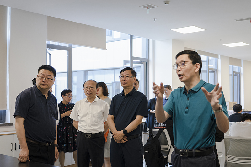 调研中,陈朝先一行首先对由学校集成电路产业学院、网络空间安全产业学院、区块链产业学院为主体建设的“无围墙”的双流新型产业学院进行了参观,详细了解了学院教学管理模式及各科研团队工作开展相关情况。