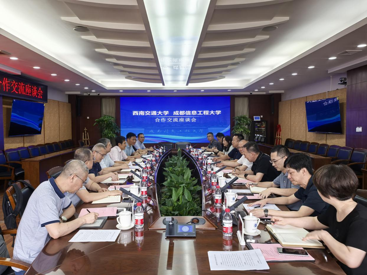 本网讯7月11日下午,西南交通大学党委常委、副校长王平一行8人访问我校。学校校长、党委副书记何建新,党委常委、副校长舒红平与王平一行在七会议室座谈交流。会议聚焦气象大数据赋能智能交通、防灾减灾等技术领域研发和成果转化问题展开讨论。成信资产公司董事长宫冠英、党政办公室、科技处等负责人参加会议。会议由舒红平主持。