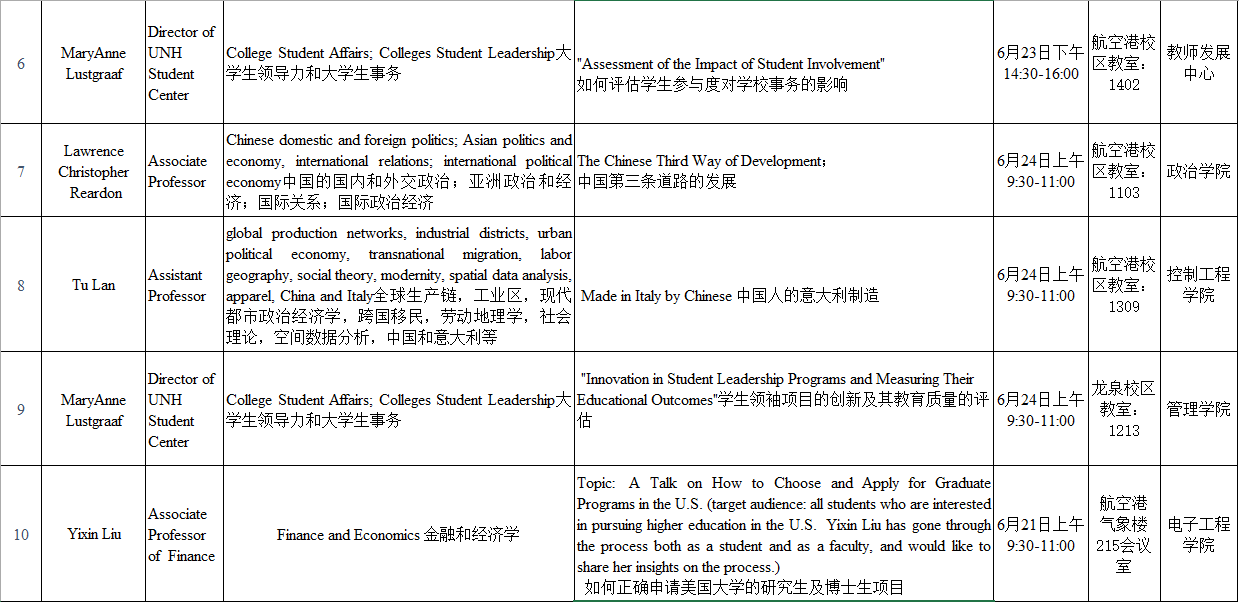 来自美国新罕布什尔大学的教授一行,将于6月20日至6月24日在我校开展12场讲座,时间和地点安排如下: