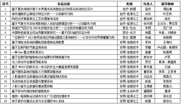 根据《关于举办第十四届“挑战杯”四川省大学生课外学术科技作品竞赛活动的通知》(川青联发〔2017〕6号)文件的要求,经我校学生团队申报,校内外专家盲审、答辩等环节,最终评定《基于复杂海域环境下水声通讯系统稳定运行的系泊系统优化设计》等20件优秀作品代表我校参加四川省第十四届“挑战杯”大学生课外学术科技作品竞赛。