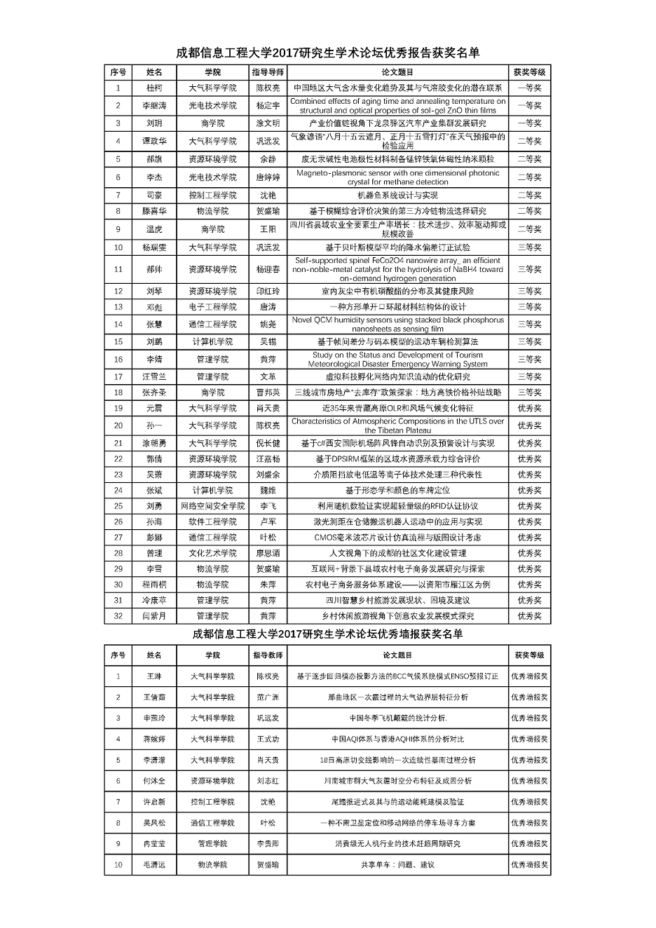 环球官方2017“研究生学术论坛”经学生申报、学院初审、研究生处复审,共征集到了学术论文45篇,摘要32篇,墙报35篇。论坛学术委员会专家分大气科学、信息科学和社会服务三组进行了口头报告和墙报评选,最终评定出优秀报告一等奖3名、二等奖6名、三等奖9名、优秀奖14名以及优秀墙报奖10名。