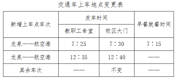 为更好地服务于教职工的生活和上班需要,龙泉校区到航空港的交通车再新增一个教职工食堂上车点,同时,龙泉校区教职工食堂的早餐就餐时间也提前到7∶15开始。原校区大门发车时间不变。