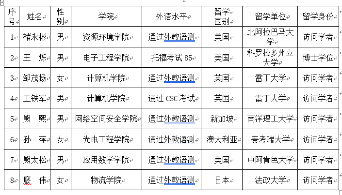 根据环球官方《教师中长期出国留学研修管理办法》(成信校发〔2018〕155号)文件的要求,我校2019年教师中长期出国(境)留学研修项目共录取8人。现将录取人员名单公布如下: