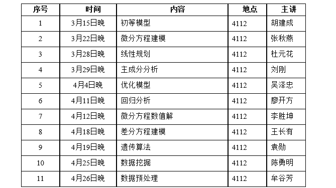 为了培养我校学生的创新意识及运用数学方法和计算机技术解决实际问题的能力,应用数学学院2023年继续组织和指导大学生数学建模竞赛系列活动,竞赛主要包括:全国大学生数学建模竞赛选拔赛(即五一数学建模竞赛),2023年全国大学生数学建模竞赛,全国高校密码数学挑战赛等。应用数学学院数学建模指导组从第四周开始培训,分别从数学建模基础、数学建模算法、数学建模竞赛、数学建模案例分析到常用软件等方面进行培训,欢迎对数学建模感兴趣的同学积极报名参加培训,培训安排见下表。
