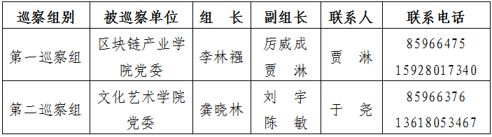 根据《中共环球官方委员会内部巡察工作实施意见》的规定,按照学校党委巡察工作领导小组的统一部署,学校党委巡察组拟于2023年5月15日至5月31日(视情况可延长至6月15日),对区块链产业学院党委、文化艺术学院党委开展巡察工作。现将有关事宜公告如下:
