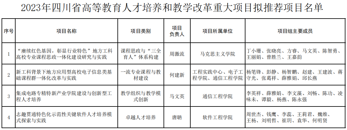 根据《四川省教育厅关于开展2023年四川省高等教育人才培养和教学改革重大项目申报工作的通知》文件要求,推荐前期立项且有较好研究、实践基础的项目优先申报,经各单位推荐及校内外专家评审,我校拟推荐《“赓续红色基因,彰显行业特色”地方工科高校专业课程思政一体化建设研究与实践》等4个项目申报2023年省级教改重大项目,详细名单见下表。