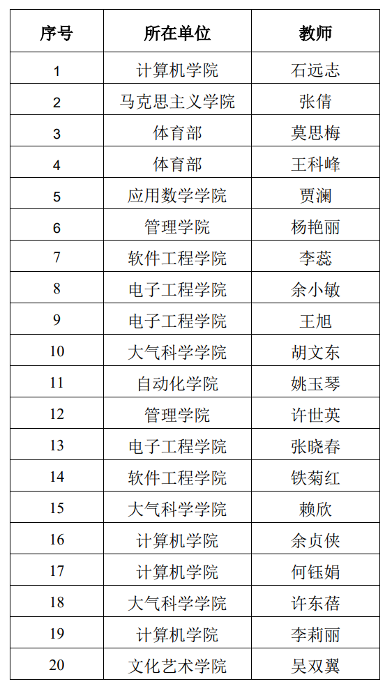 现第二阶段网络投票时间已结束,根据有效得票数高低,选出进入决选阶段的20位候选教师,现将名单予以公示: