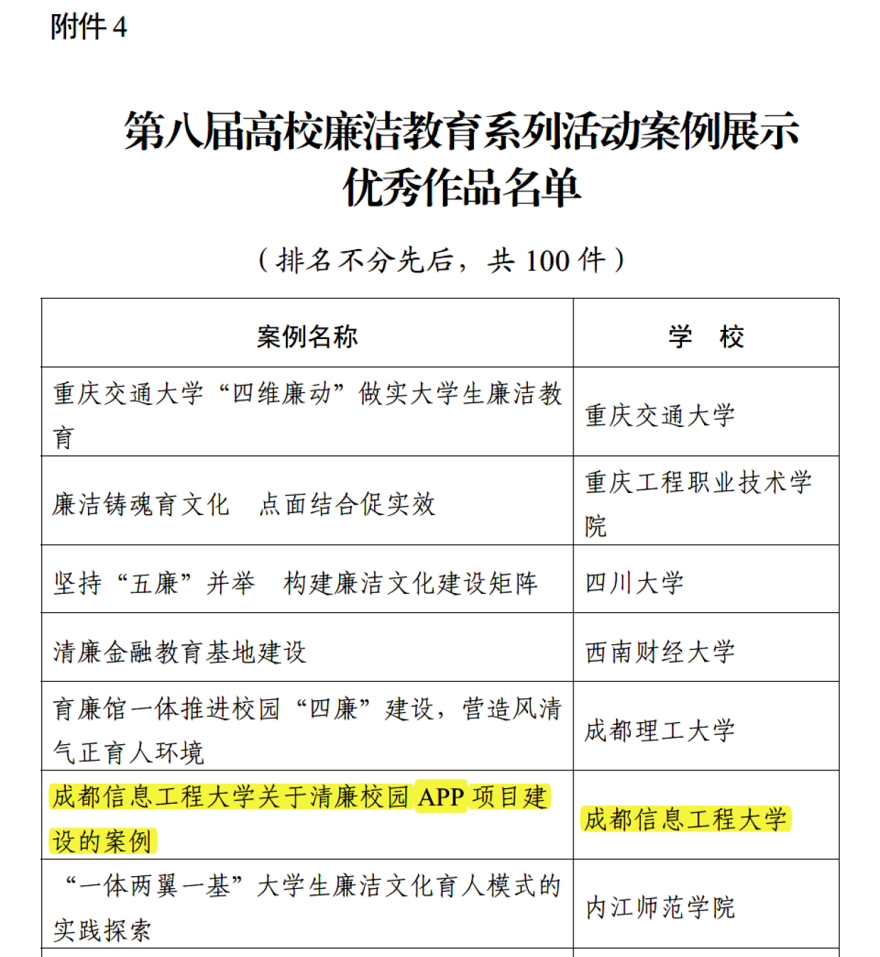 【本网讯】近日,由教育部办公厅主办的“廉洁润初心 铸魂担使命——第八届高校廉洁教育系列活动”评选结果公布,由学校纪委牵头报送的“清廉校园APP项目”被评为案例展示优秀作品,由我校党委宣传部推荐报送的征文作品《倡清廉学风,扣好廉洁人生第一粒扣子》被评为校园征文优秀作品,入选项目数位列四川省内高校第三。