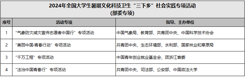【本网讯】近日,共青团中央发布了2024年全国大学生暑期文化科技卫生“三下乡”社会实践活动专项名单。我校承办的“气象防灾减灾宣传志愿者中国行”大型科普活动继2023年首次入选全国大学生暑期文化科技卫生“三下乡”社会实践活动13个专项之后,今年,该活动成功入选全国4个“部委专项”之一。