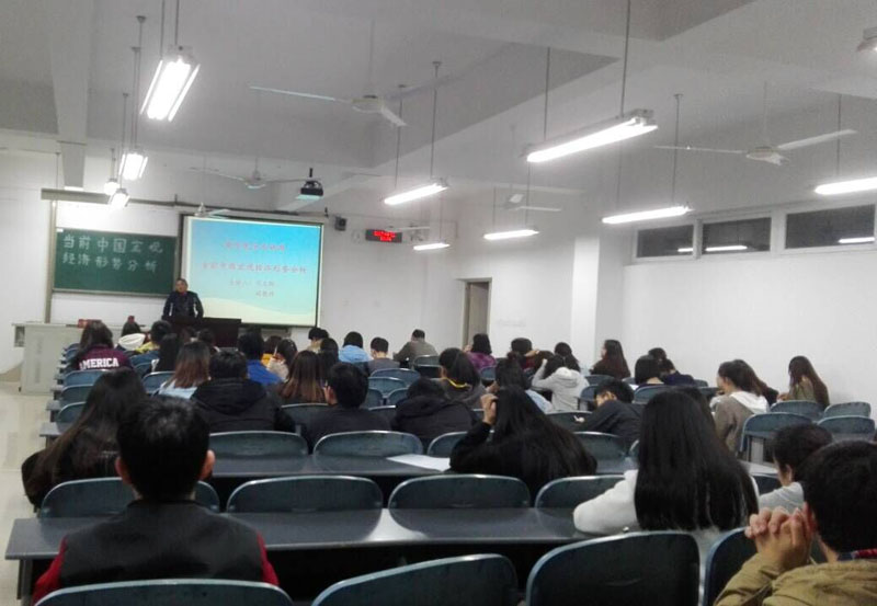 他还结合相关的实例分析了供给侧结构性改革、混合所有制改革、“一带一路”等国家重要经济策略,全面细致地诠释了当前中国宏观经济的形势。沈老师认为,混合所有制改革这使产业私有化、民营化、股权结构多有化,打破了绝对垄断,实现资产利用最大化。他认为中国“一带一路”的全球化发展战略可以很好地绕过贸易壁垒,引领中国外交及对外贸易快而好的发展起来。讲座后,沈久辉老师与同学们进行了精彩的互动和深入的交流,沈老师对宏观经济非常准确的预测和判断,获得了同学们的一致好评,讲座取得了圆满成功,同学们受益匪浅。