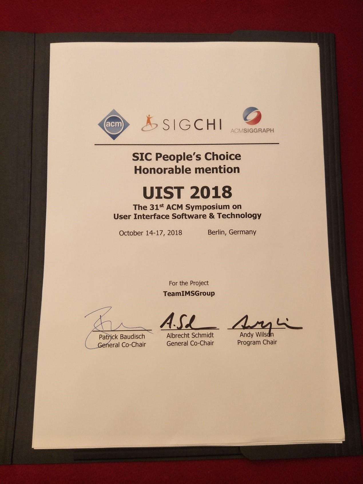 【本网讯】近日,第六届ACM空间用户交互研讨国际会议( Symposium on Spatial User Interaction 2018,简称SUI)以及第三十一届ACM用户界面软件与技术研讨国际会议(the 31st Annual ACM Symposium on User Interface Software andTechnology,简称UIST)分别于10月12日至13日以及10月14至17日在德国柏林召开。