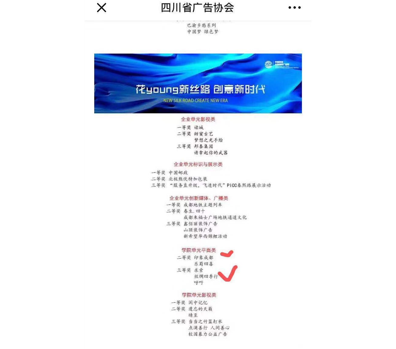 【本网讯】3月19日,首届中国西部丝路国际广告大赛在成都世纪城天堂洲际大酒店天府厅落下帷幕。 在指导老师向伶梅、田晓膺的带领下,我校文化艺术学院视觉传达设计2017级学生徐嘉仪、蒋璐、闫稳旭、邓家苗的作品《印象成都》荣获平面类二等奖;2015级学生贾萍萍的作品《丝绸四季行》荣获平面类三等奖。
