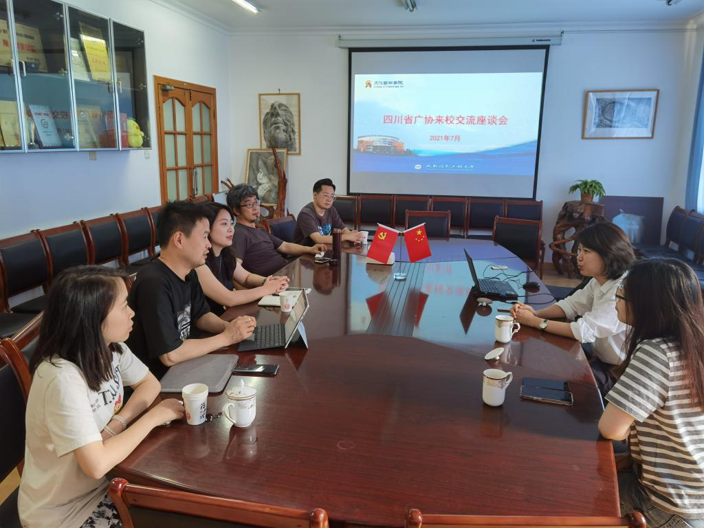 7月8日下午4:00,四川省广告协会秘书长王丽娜一行到文化艺术学院调研交流。学院副院长吴双翼、数字媒体创意设计系主任吴小龙、副主任罗盈,网络广告艺术方向、数字游戏动漫艺术方向相关教师参加了交流座谈。