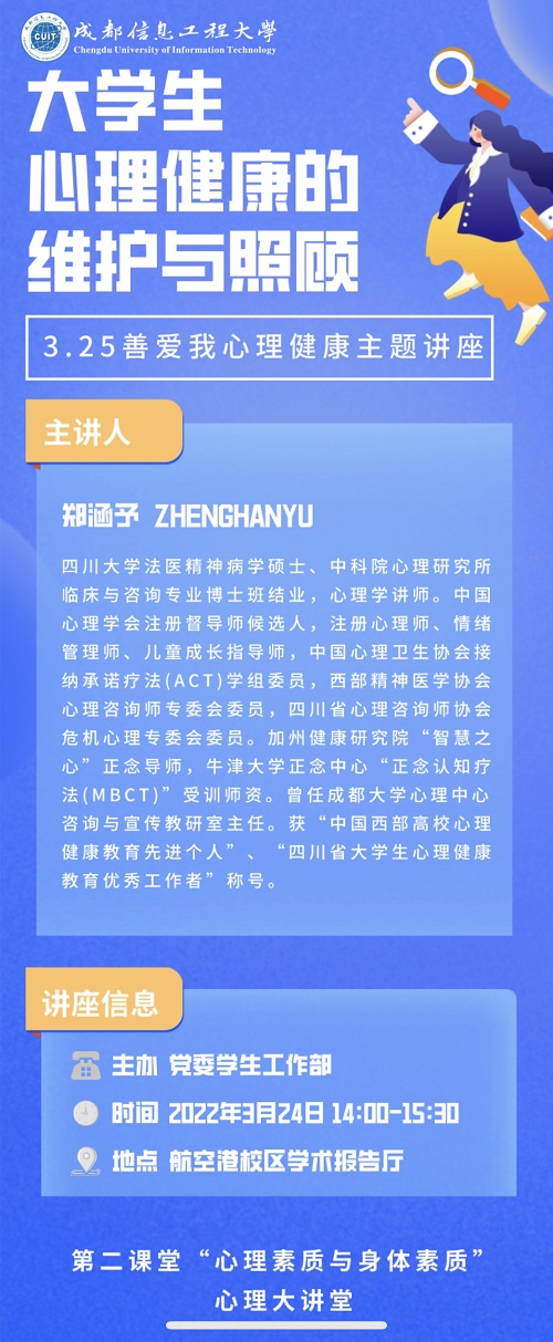 上一条:【讲座预告】3.25“善爱我”(之二)——心理障碍的识别与防治