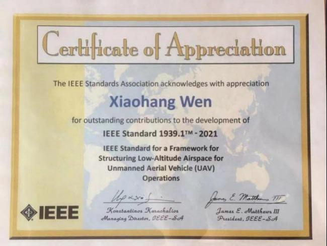 【本网讯】近日,IEEE标准化委员会向我校大气科学学院文小航副教授颁发嘉许证书,为感谢文小航副教授在IEEE1939.1“面向无人机运行的低空空域结构化框架标准”中做出的重要贡献。