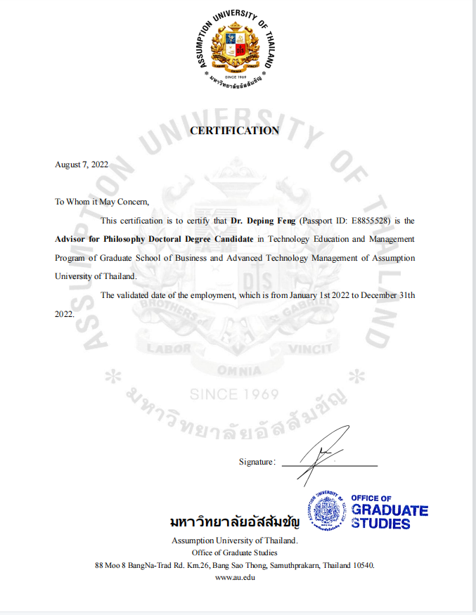 【本网讯】近日,经泰国易三仓大学研究生院学术委员会审议通过,我校外国语学院冯德平副教授受聘为该校研究生院博士研究生指导教师。冯德平副教授具有博士学位,毕业论文指导经验丰富。冯德平副教授的受聘,突出了国外院校对我校教师学术能力和科研水平的认可,有助于我校外语学科集群师资队伍建设和高层次人才培养。