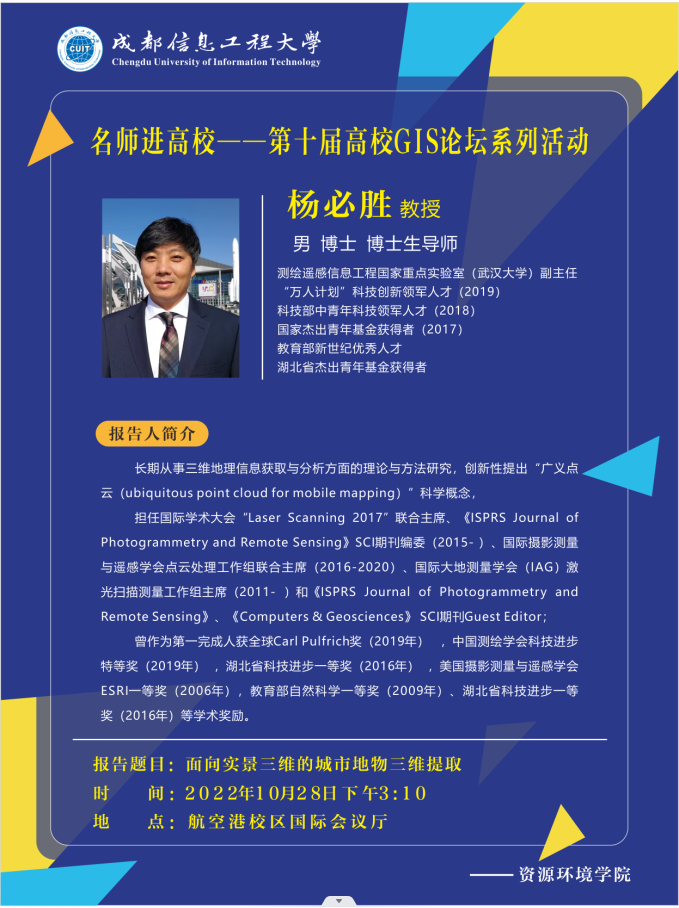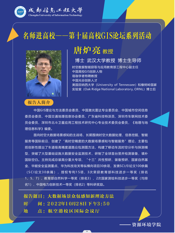 【本网讯】作为第十届高校GIS论坛系列活动之一,“名师进校园——环球官方站”于2022年10月28日至29日在环球官方航空港校区国际会议厅成功举行。此次学术活动由资源环境学院承办,科技处、研究生处给予了大力支持。活动由资源环境学院院长徐成华教授主持,来自北京大学邬伦教授、南京大学杜培军教授、武汉大学杨必胜教授和唐炉亮教授、深圳大学涂伟副教授多位名师走进我校,为地理信息科学、遥感科学与技术、测绘工程等专业的两百余名在读大学生和研究生奉献了一场有关地理信息科学、遥感、现代测绘的学术盛宴。