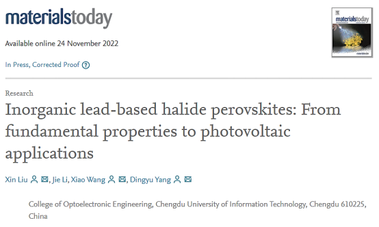 【本网讯】11月24日,国际顶级学术期刊《Materials Today》(1区TOP,IF = 26.94)杂志在线发表我校作为唯一单位的论文“Inorganic lead-based halide perovskites: From fundamental properties to photovoltaic applications”。该工作由我校光电工程学院杨定宇教授团队完成,刘欣博士为论文第一作者,团队王晓博士、杨定宇教授为论文通讯作者。