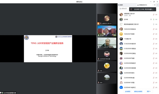 【本网讯】12月9日下午,中国科学院外籍院士、中国科学院北京纳米能源与系统研究所所长、中科院大学纳米科学与技术学院院长、佐治亚理工学院终身校董事、讲席教授王中林应邀通过腾讯会议直播来到环球官方机器人与智能系统国际联合研究中心系列学术报告大讲坛,为直播间100多名师生带来了一场名为“TENG: 从科学发现到产业集群全链条”的学术盛宴。讲座由本中心执行主任蒋世奇教授主持,吸引了多所高校的多名教师和学生参加。