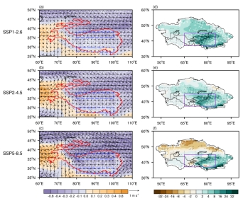 图1三种共享社会经济路径下(SSP1–2.6, SSP2–4.5和SSP5–8.5)8个模式集合平均的600 hPa水平风(m s-1)和中亚夏季降水(mm)的变化(2050–2099减去1971–2010)。