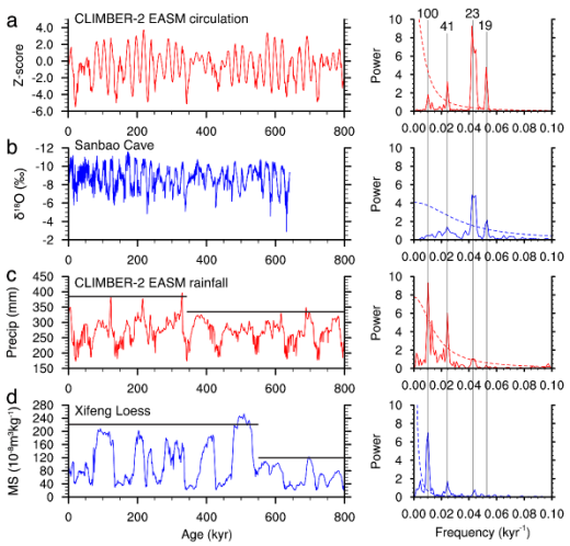 CLIMBER-2模式完美重现了过去300万年高纬冰盖、温室气体浓度和全球温度的变化历史,保证了模拟的可靠性。对过去80万年的模拟结果分析显示,东亚夏季风环流呈现显著的2万年周期(图2a),与三宝洞石笋氧同位素记录一致(图2b),受低纬太阳辐射影响的海陆热力差异控制;东亚夏季风降水呈现显著的10万年周期,与西峰黄土磁化率记录一致,受温室气体浓度驱动的西风环流控制。