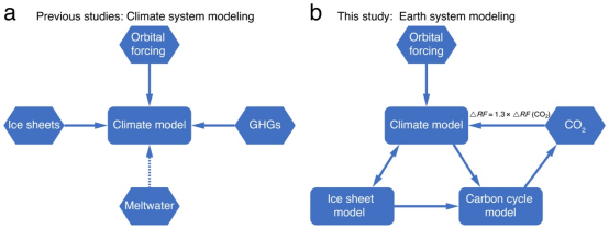 针对这一谜题,许多研究者寄希望于气候模拟,然而过去的瞬变模拟试验始终无法揭示其中10万年周期的形成机制。以往瞬变模拟试验多采用单向强迫的敏感性试验方案(图1a),冰量和温室气体浓度单向强迫于气候系统,而气候系统没有对冰量和温室气体产生反馈作用,且冰量和温室气体之间也不存在强迫和反馈过程,因此,忽略了地球系统各圈层之间的相互作用过程。本研究利用中等复杂程度地球系统模式CLIMBER-2,在地球轨道参数的强迫下对过去300万年气候变化开展连续瞬变模拟,在本模拟试验中冰盖模式、碳循环模式和气候模式动态耦合(即地球系统思维),冰量和温室气体浓度由模式模拟,充分考虑了地球系统各圈层之间的相互作用过程(图1b)。